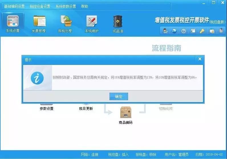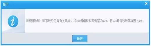 2019年4月1日,啟用稅率調整,老用戶更新編碼時有提示“按照財政部、國家稅務總局有關規定,將16%增值稅稅率調整為13%,將10%增值稅稅率調整為9%”,(此提示只顯示一次);新用戶不顯示相關提示。