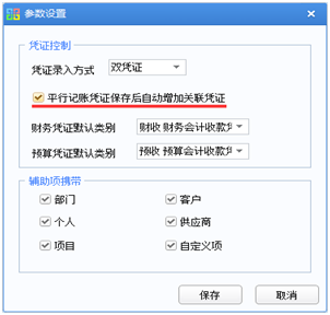 填制財務會計分錄并保存憑證后,根據“參數設置“是否勾選“平行記賬憑證憑證保存后自動增加關聯憑證”,來生成關聯憑證。如:勾選,則保存憑證后,系統自動生成關聯憑證;反之,則需手動在填制憑證界面上,點擊“增加”--”平行記賬“節點來生成關聯憑證。